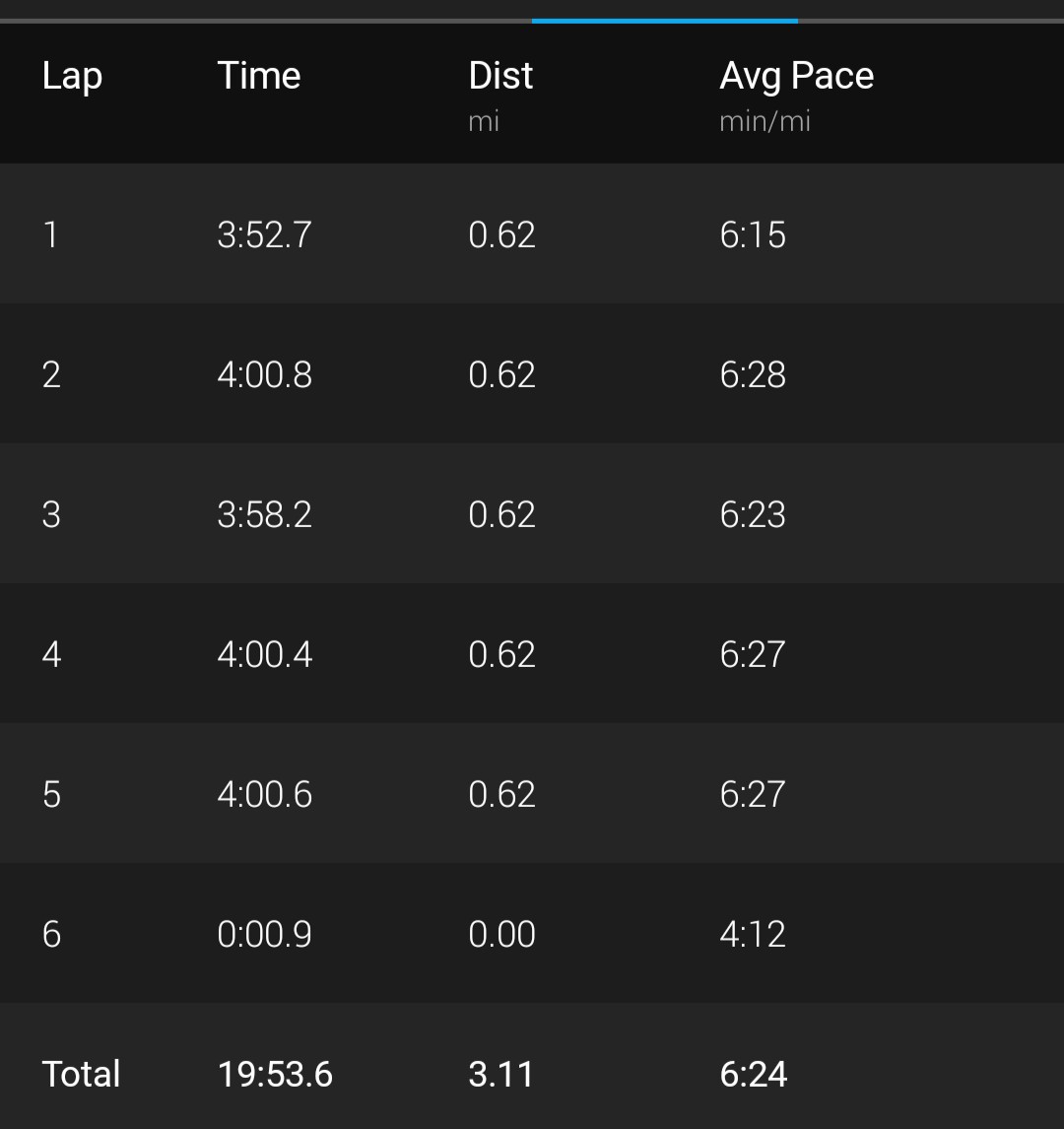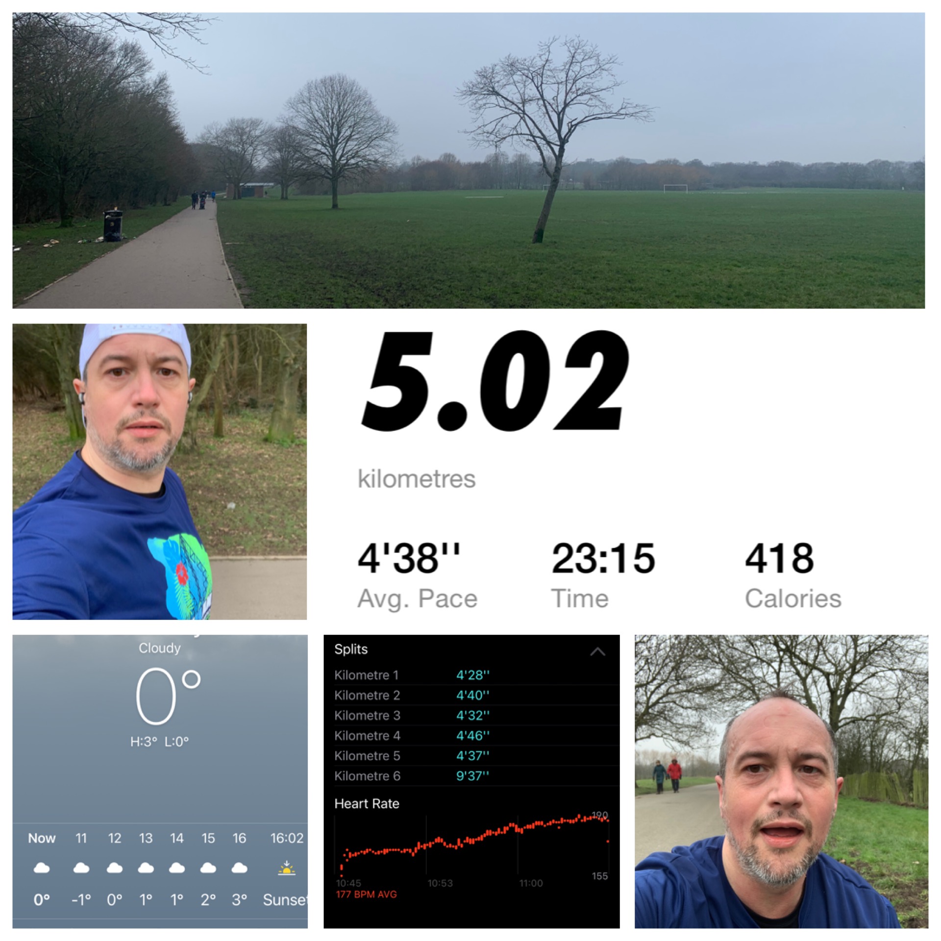 1st km I went off too hard checked my pace at 400m was 4:15/km, hands were absolutely freezing by 2nd km and at the halfway I was thinking about calling it a day at 3km. Had to yell excuse me a few times to stay on the path and at pace but around the end of 4km I had to stop for about 6s after pushing the pace to make a gap between walkers, then picked it up again and dodged around some kids and dogs and on to glory!