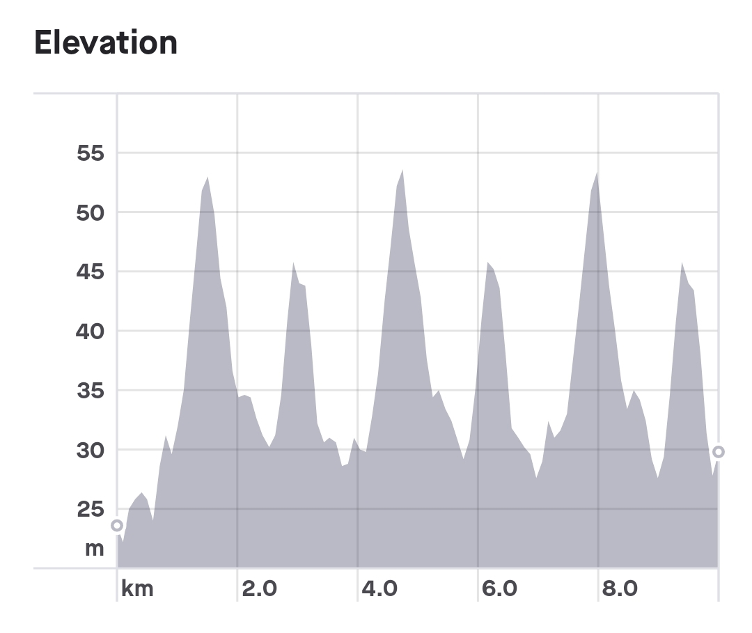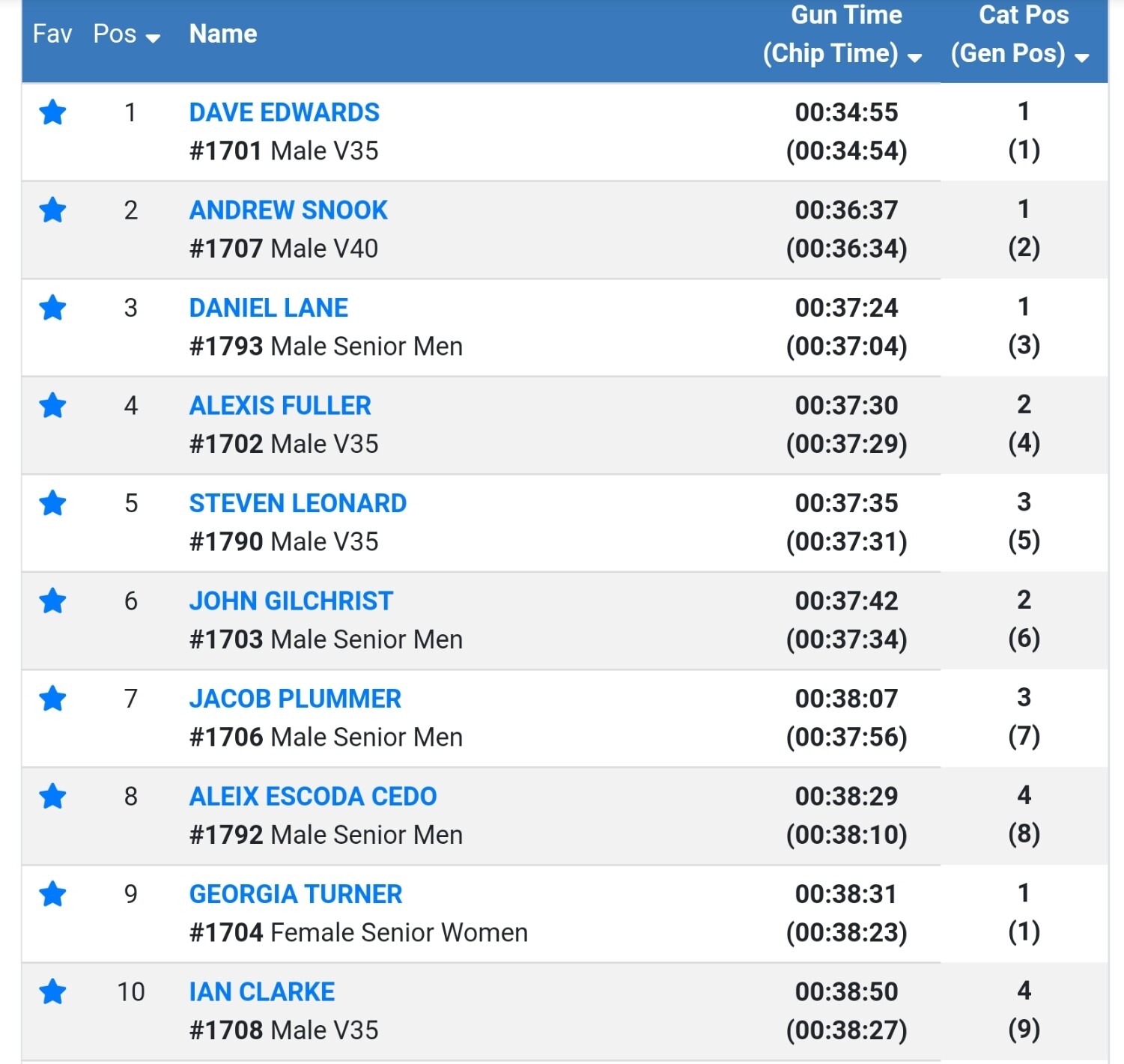 Died a little on the final lap and lost two places, but still finished just a shade outside 37:30. I’ll take that time on such a course, and top 5 is nice. Weird having a TT start, with four people going off every few seconds