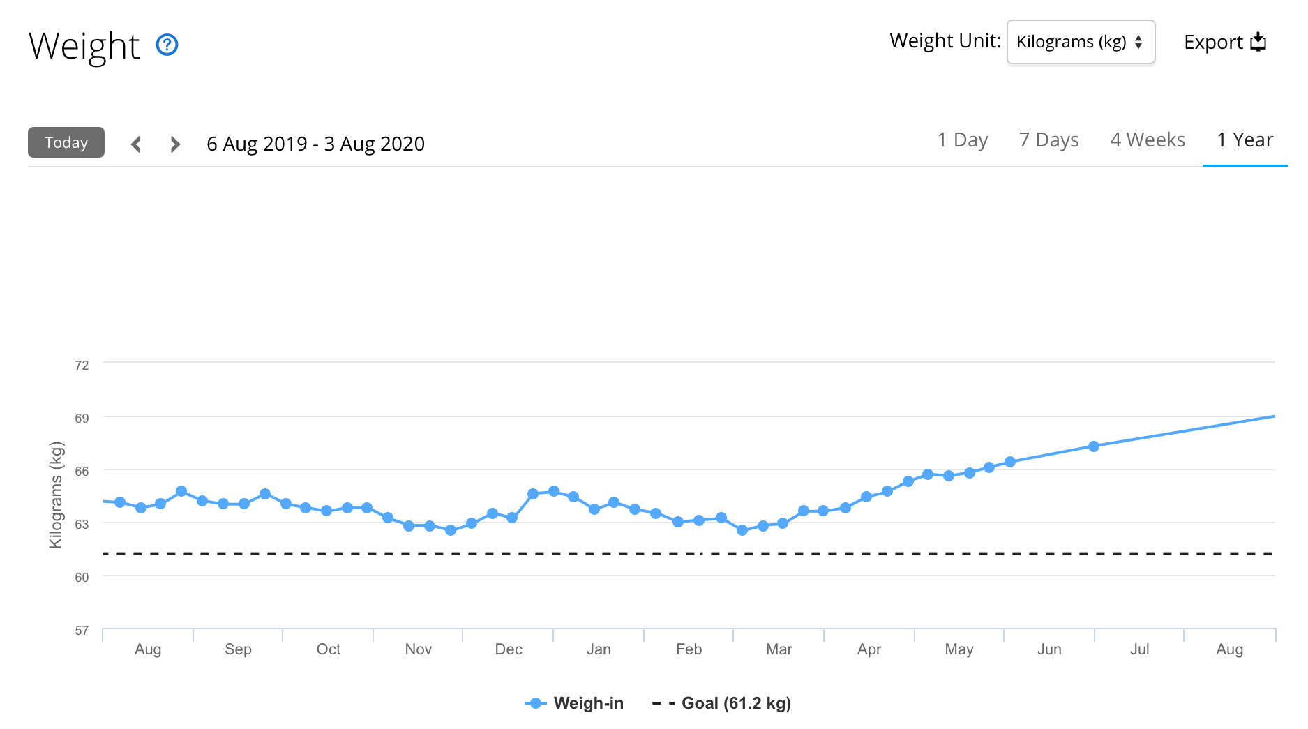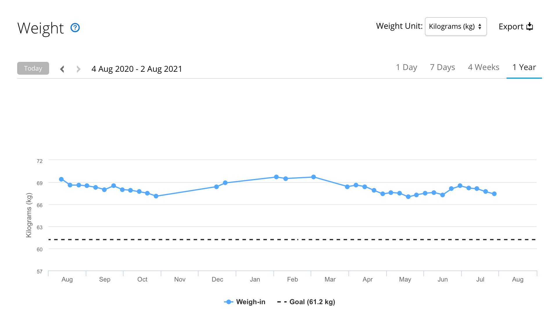 just looked however, and my race weight for when I was going at my best (just for clarity, ‘at my best’ is a relative thing….) was 62Kg, so a bit to be done over the next year. The point at which lockdown first started tells a stark story….