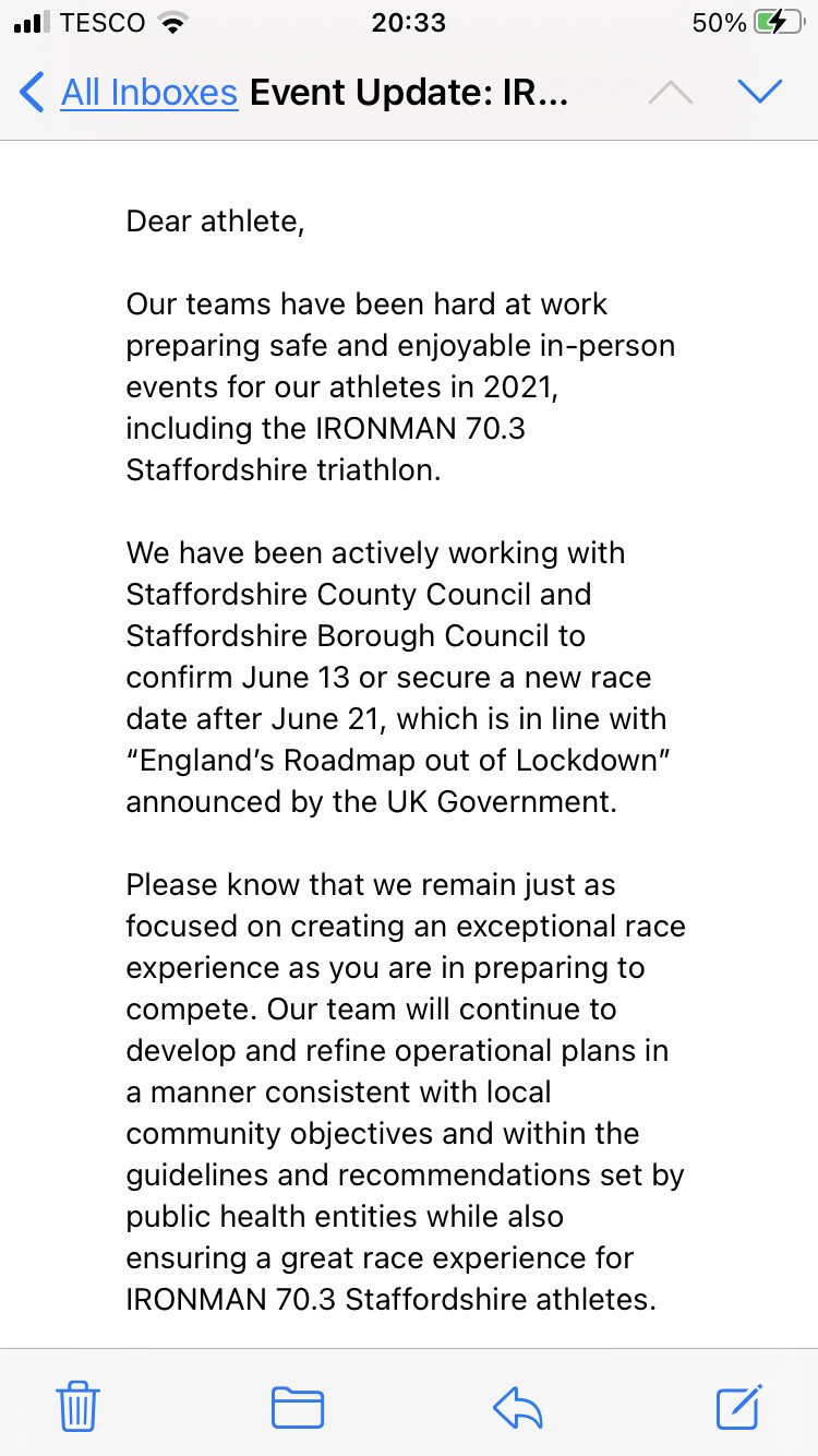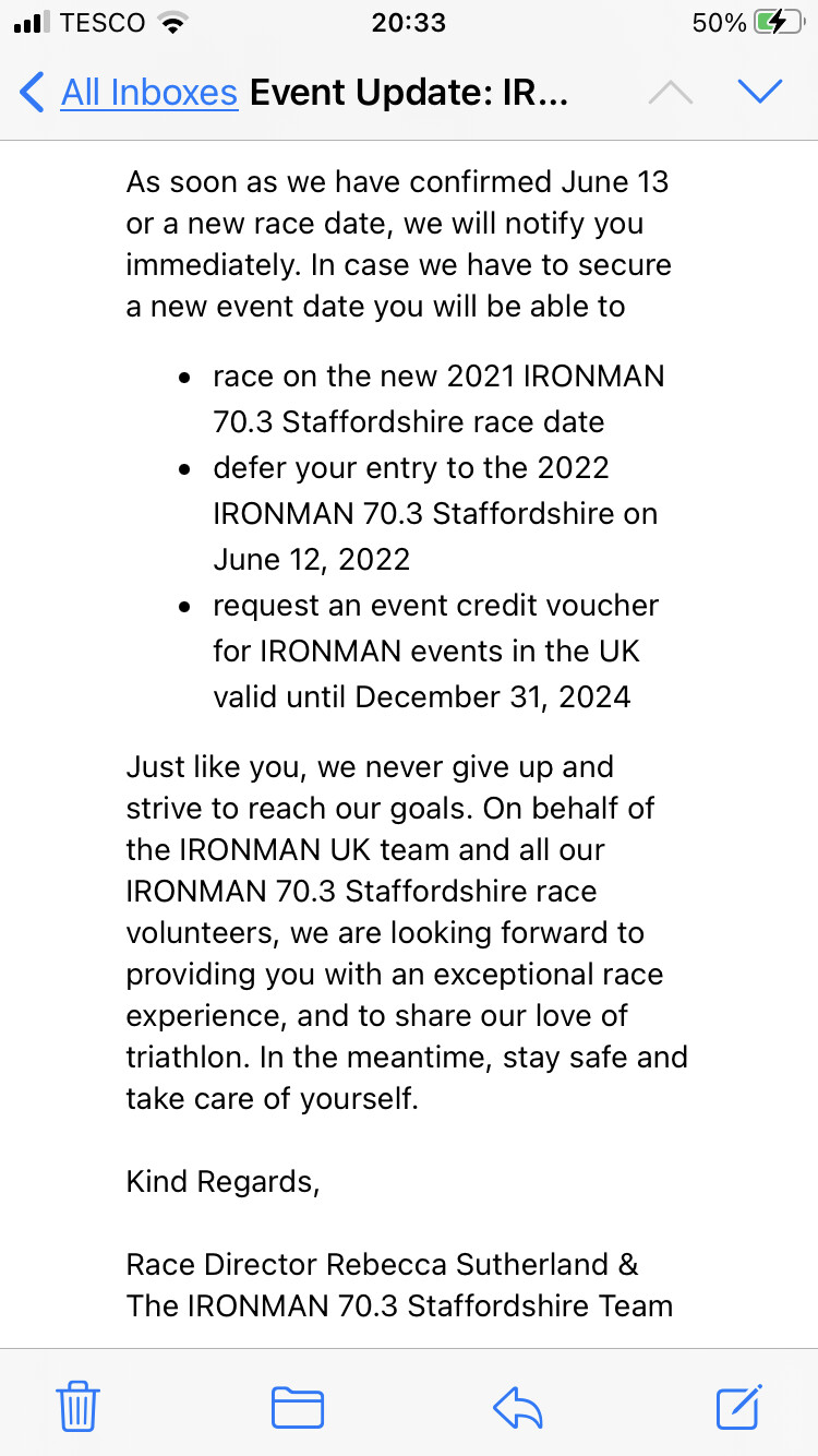 Emailed regarding any potential transfer of entry towards Taupo 2021 (which is still on early bird entry) given I won’t be around for Staffs, was met with a very firm no.