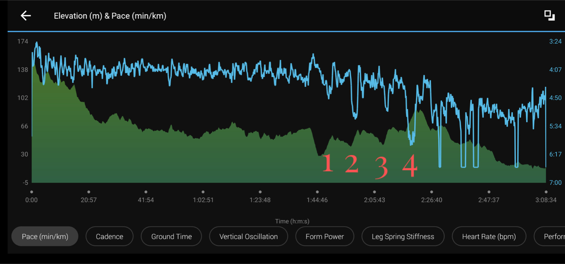 Climbs #2 and #3 saw slower ascents, and slightly reduced recapturing of speed. But I was still broadly on track for sub3 if I could have done the same after heartbreak.