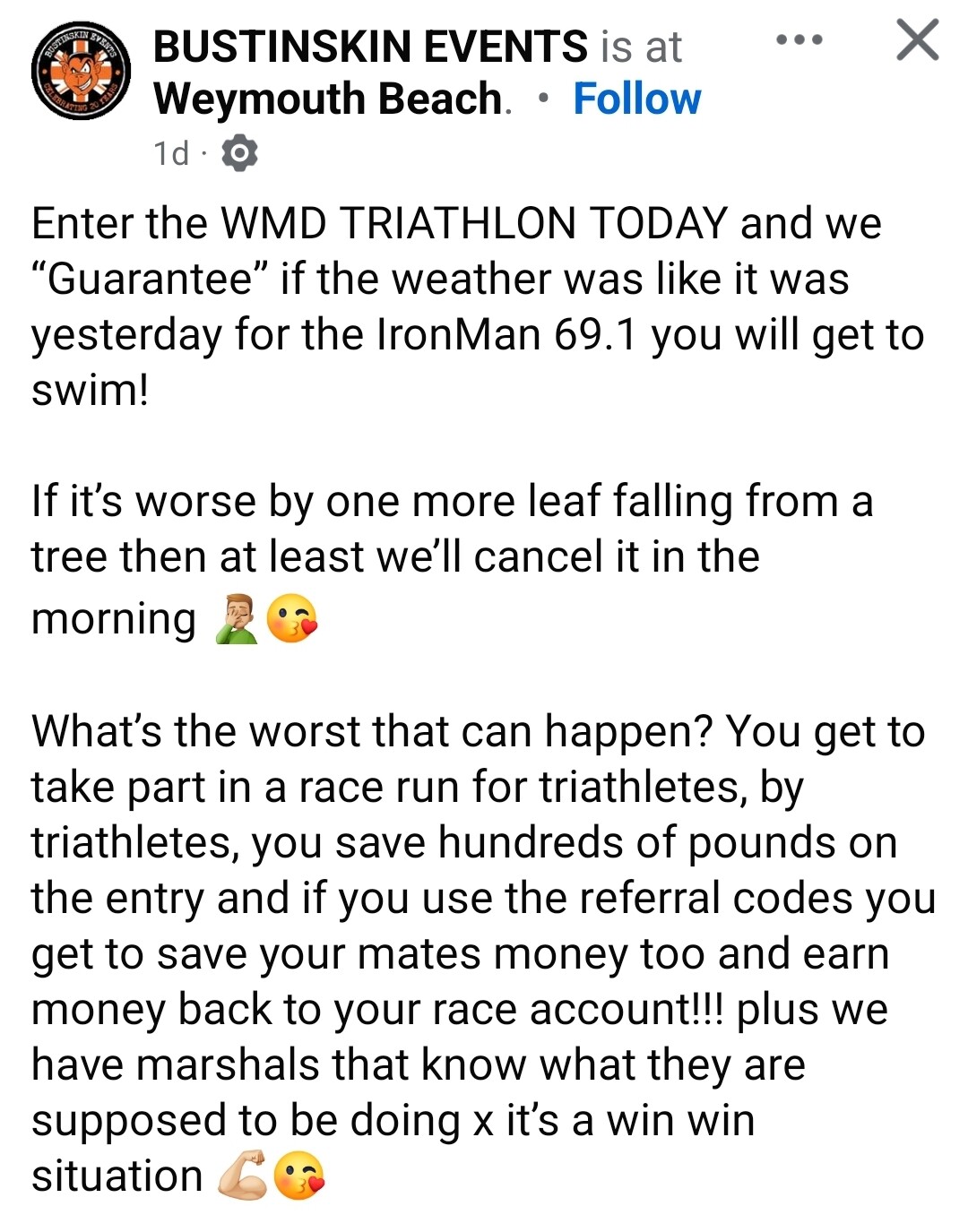 I have done race to the Bill a couple of times, Weymouth classic oly and the midweek aquathlon series in the summer. It’s our nearest bit of sea which is the main reason, but they are well run and sensibly priced