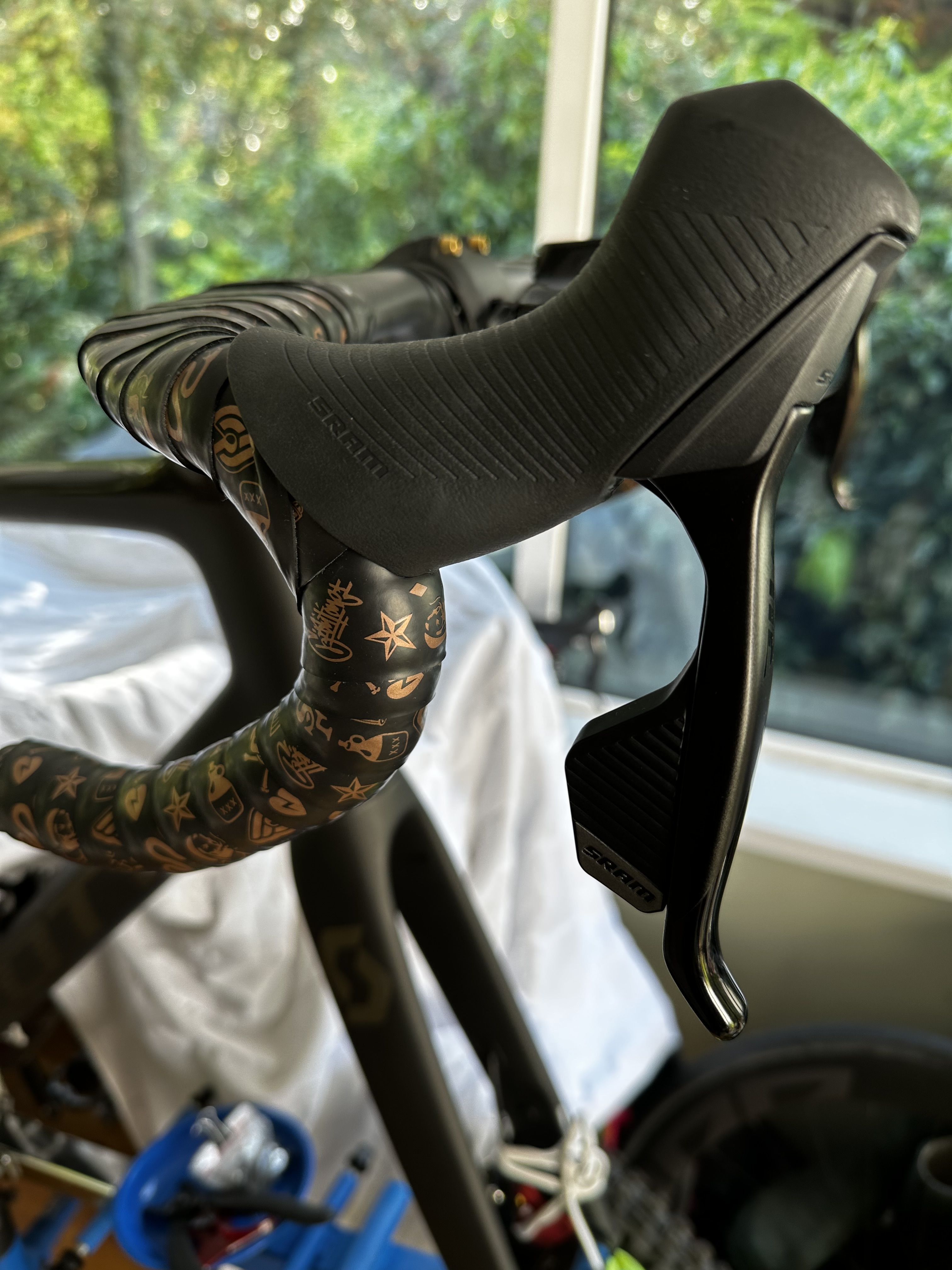 Best thing about new AXS is the wireless “blips” you can buy (second pic, under bars). Satellite shifting buttons. Just glue them to your bars, TT extensions, helmet(!) wherever you like and shift from there. Both derailleurs. Or pair them to your mate’s bike when he’s not looking and mess with him on the hills ![]()