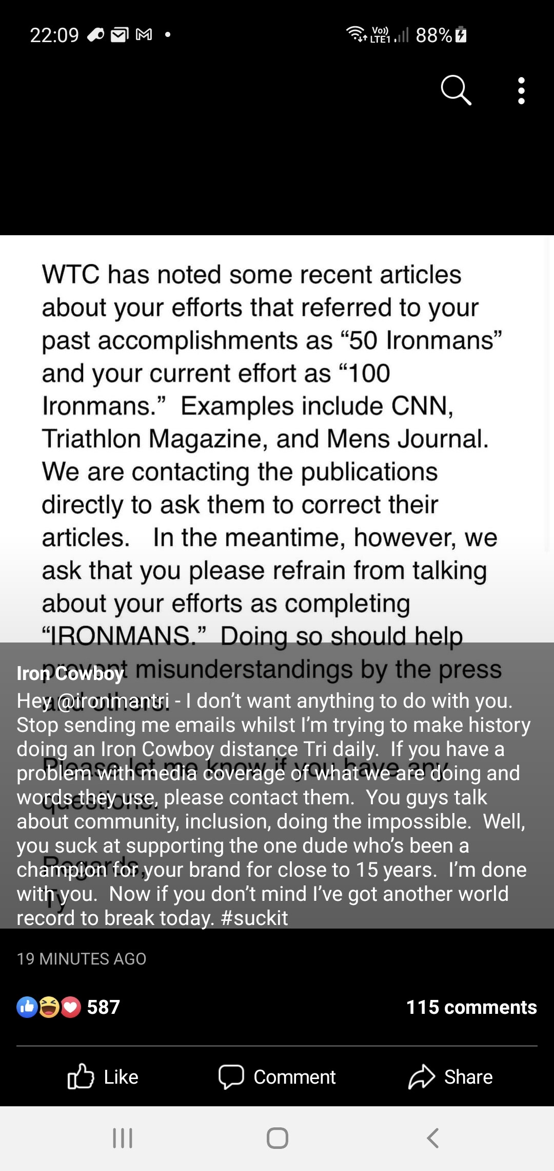 I can’t see the comments but I don’t blame IM here. This is not like Specialized going after a cafe owner in Canada. It’s also not the same as an AGer saying they did an Ironman when they did a 226km iron distance tri. (this was extremely common ‘back in the day’ and nobody cared)