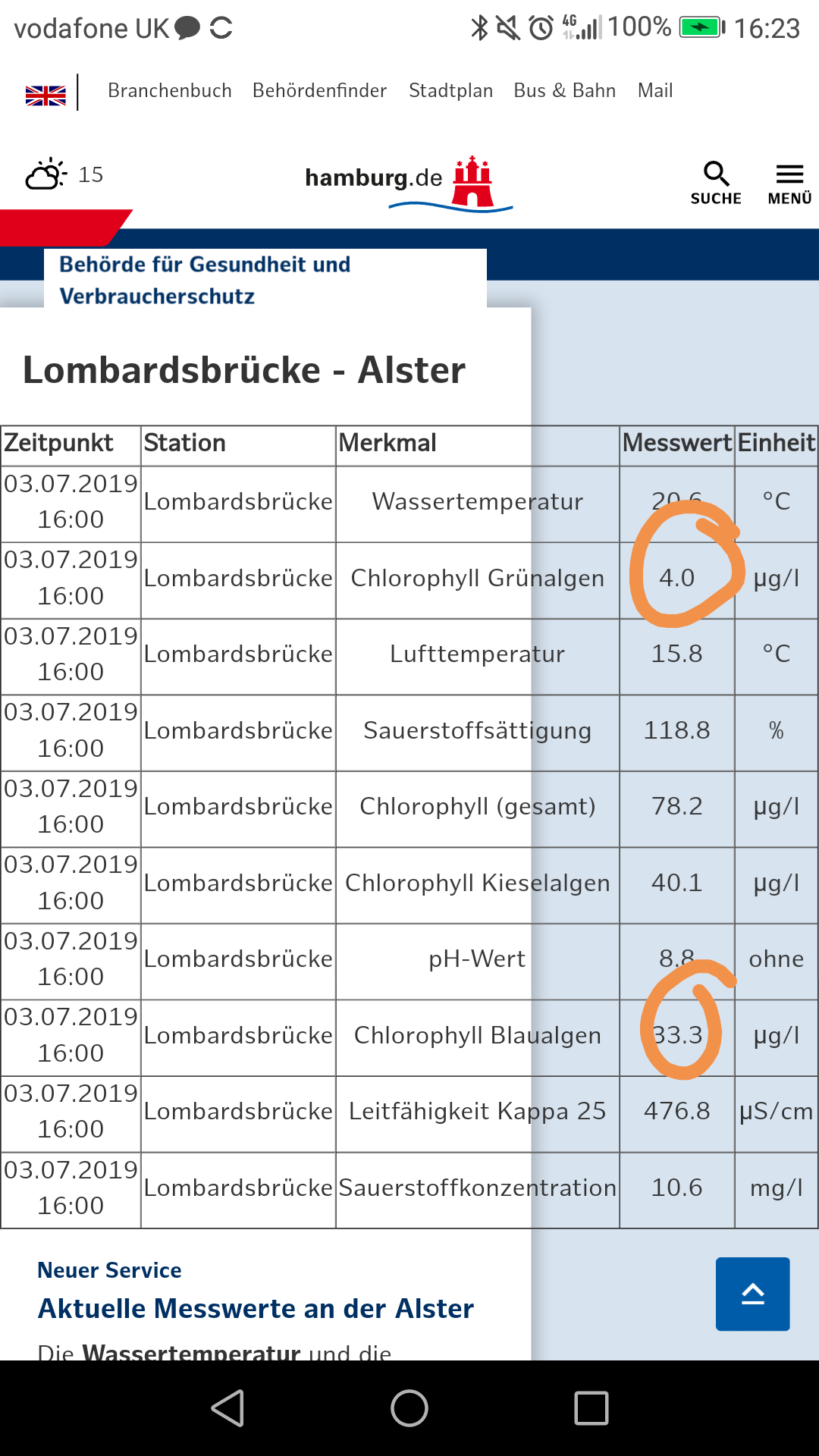 You want the Chlorophyll Blaualgen under 75.0 pg/l (bathing prohibited) looks like it’s currently at 33.3 pg/l. It’s difficult to tell exactly which measurement of what chemical, as there are several very similar componds they measure. A straightforward blue algae (blaualgen) measurement of 15.0 pg/l is supposed to trigger a warning system, whatever that entails.