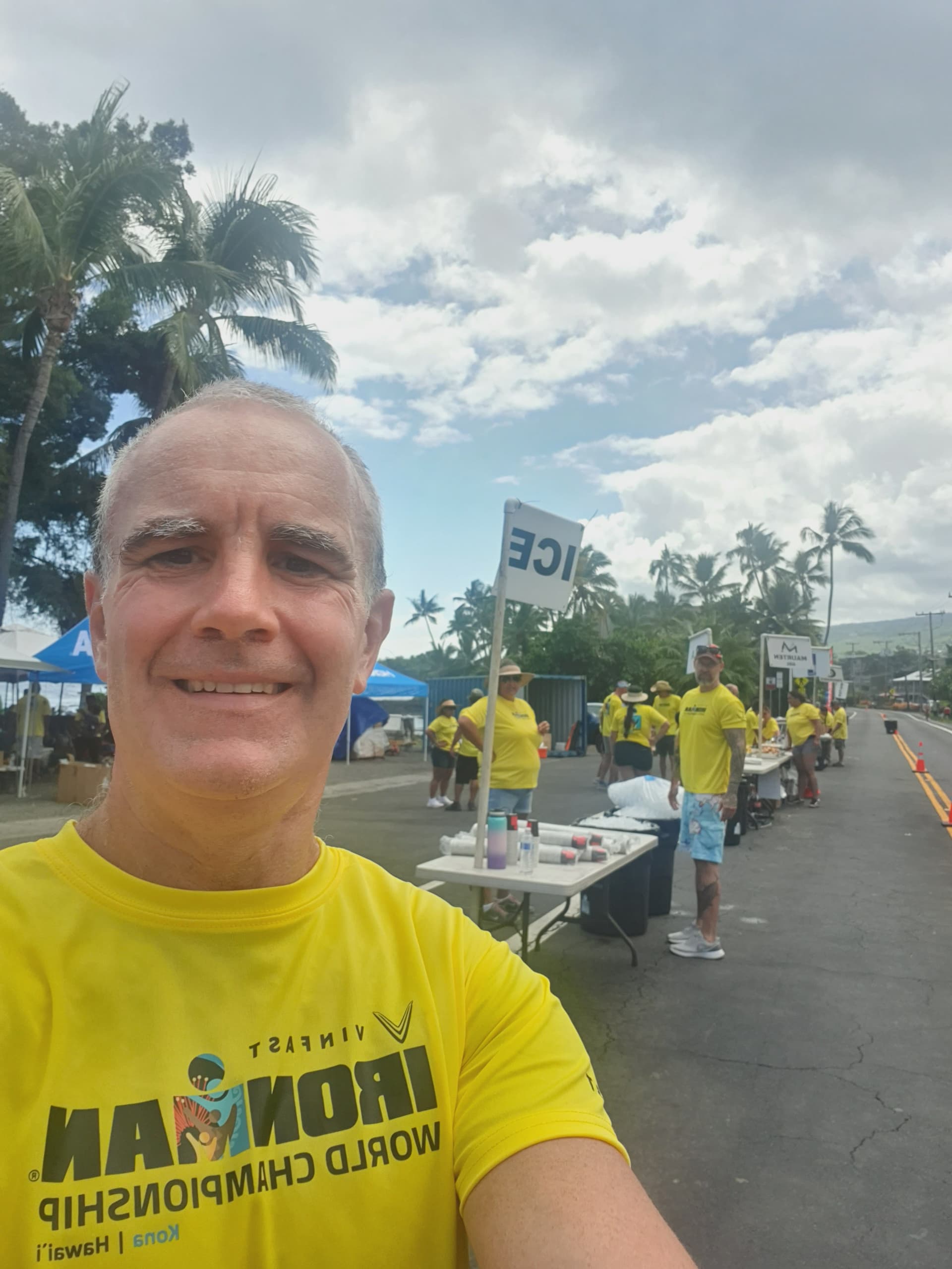 Setting up aid station on Ali’i drive Cloudy and pretty cool at the moment