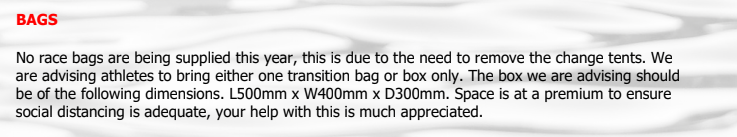Have you sorted a box for transition? I literally have a garage full of plastic boxes after some enthusiastic organisation and new racking earlier in the year…I finally found one(!) which fits the suggested dimensions (40x50x30cm) and it seems awfully small. I was just going to use a transition bag, but as it is likely to be raining would be nice to have some dry socks/shoes to start the run.