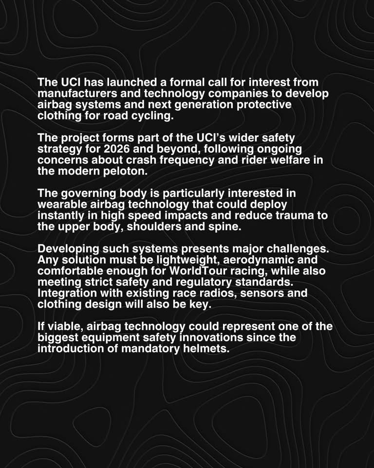 Airbags have been mandatory in downhill and super g skiing for the last year or two, probably similar technology as would be needed for cycling (but with fewer concerns about it being too hot!)