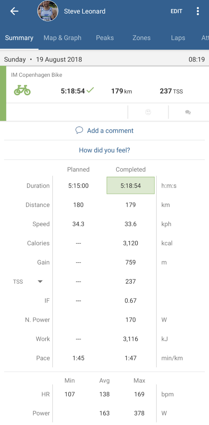 This was my first IM on a TT bike, interestingly(ish) when I did Outlaw the previous year (the one as mentioned held on the sun), I was on a road bike with clip-ons and did exactly the same time to nearest minute, 5:32, so I must have been churning out more power that year. I was unable to run, but of course I blame that on the heat and not the over biking…