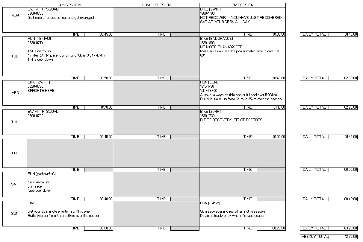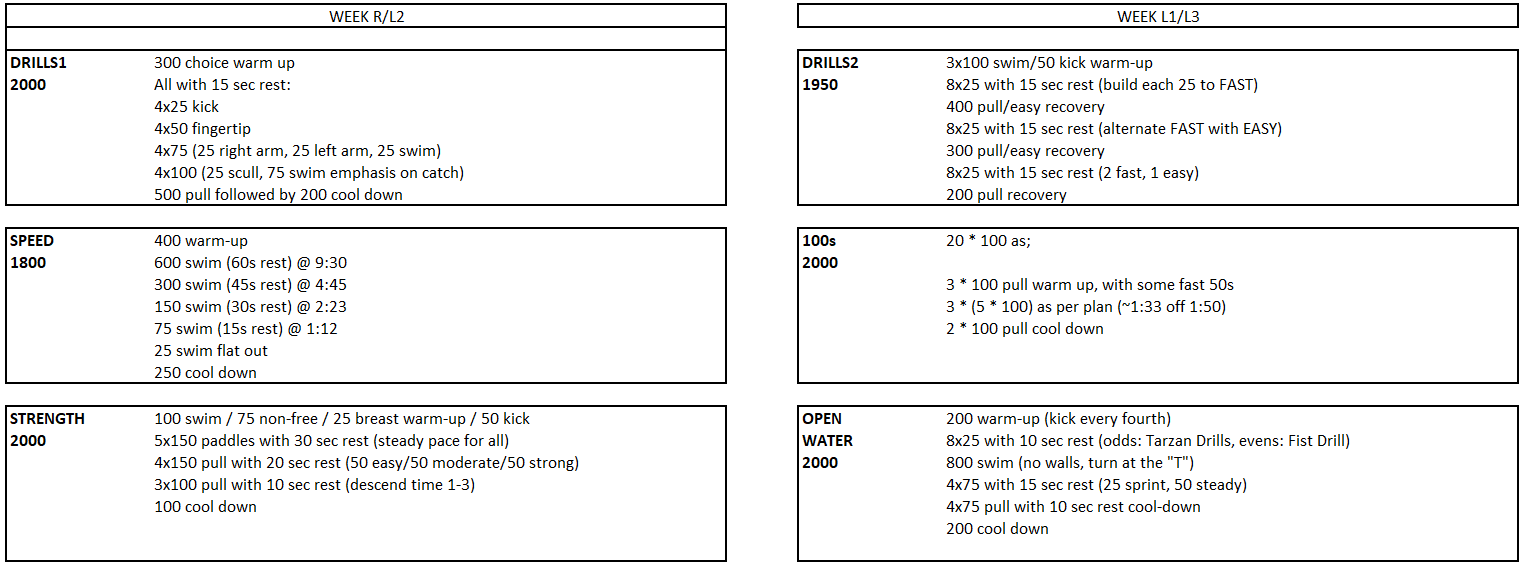 I don’t need to swim as much, so is more stacked with cycling, hours go from 8 hours per week to 15 hours in peak phases: