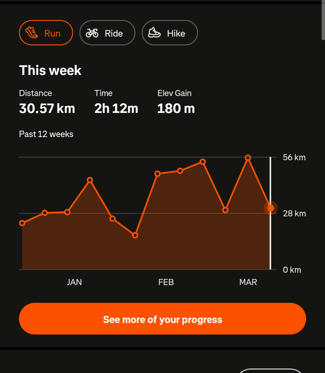 Have managed 6 runs >25km, and the last few have gone well with pace intervals. But total volume poor - only 6 weeks > 42km (Inc this week by the end) and not got swim/bike volume to fall back on either so will be very wary of the back 10km biting.