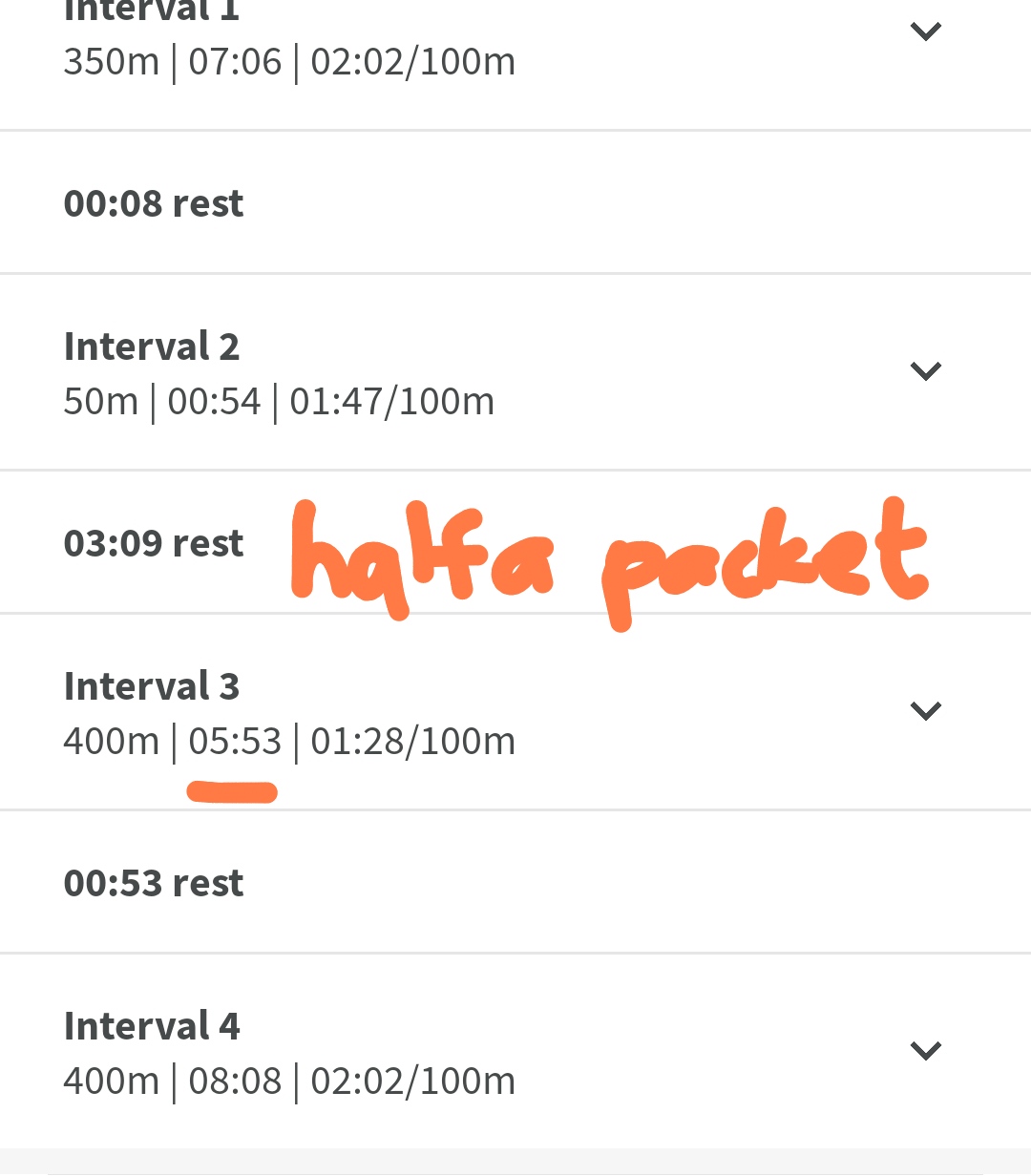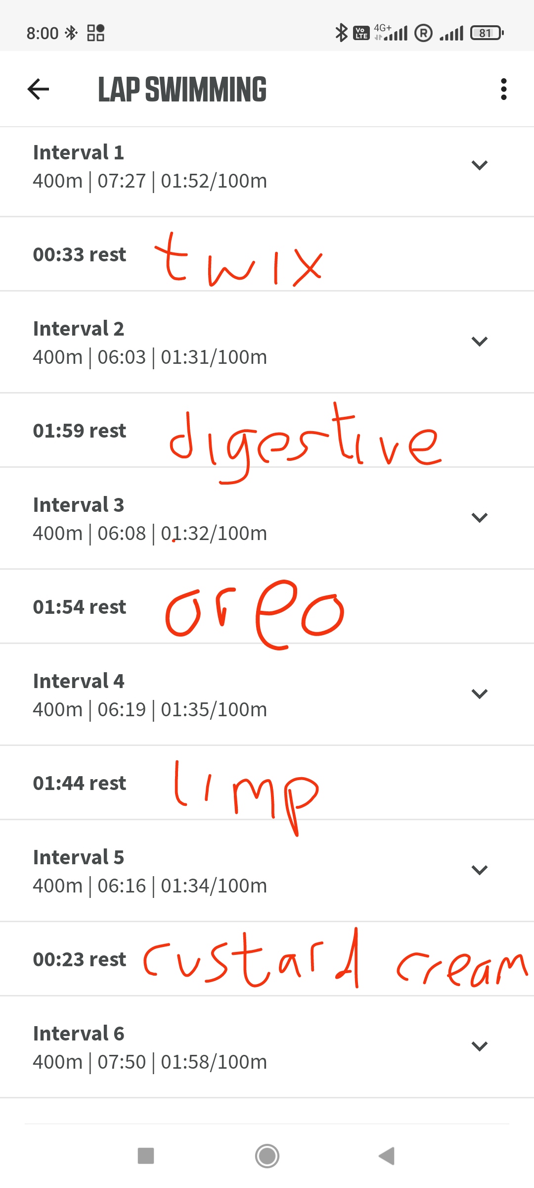 I had planned to do some 100s after that 400m effort , but was so chuffed to break 6 minutes for the first time this year, I just swam down and got out for a coffee