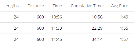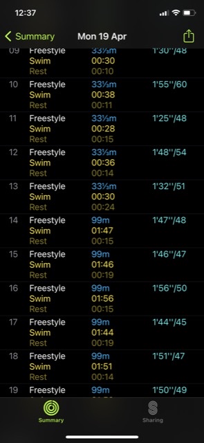 45 minute session I swam 2125m in 34:27 for an ave of 1:37/100