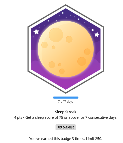 Conversely I had a sleep score of 93 last night that helped earn me a Sleep Streak badge from Garmin, 75+ for 7 consecutive days which apparently I’ve only ever had 3 times.