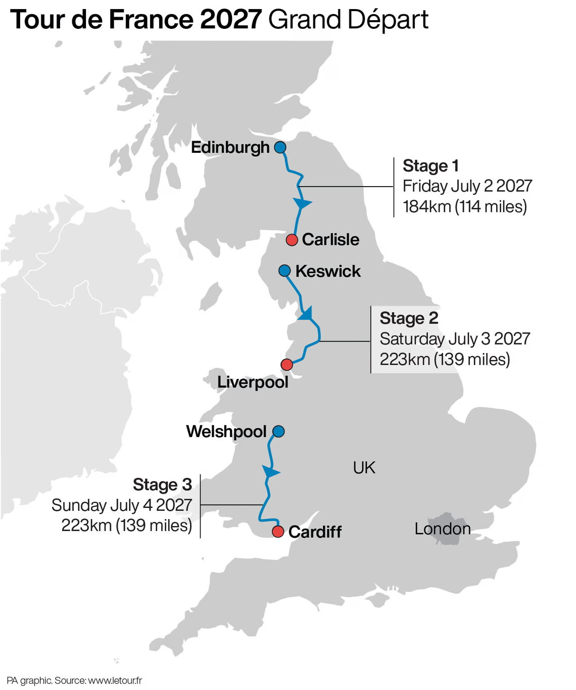 Tour de France Femmes starts in Leeds on 30 July with a first stage to Manchester and a second stage through the Peak District to Sheffield. The final day of Tour racing is in London on 1 August, although exact route details are yet to be specified.