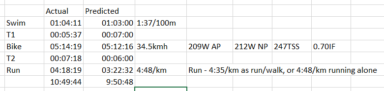 A riding buddy of mine did his first LD at Outlaw yesterday. Really solid result coming in 11:49, not bad on a road bike with clip on bars and finished with a cracking run. His swim is a bit slower than yours but came through that in 1:20.