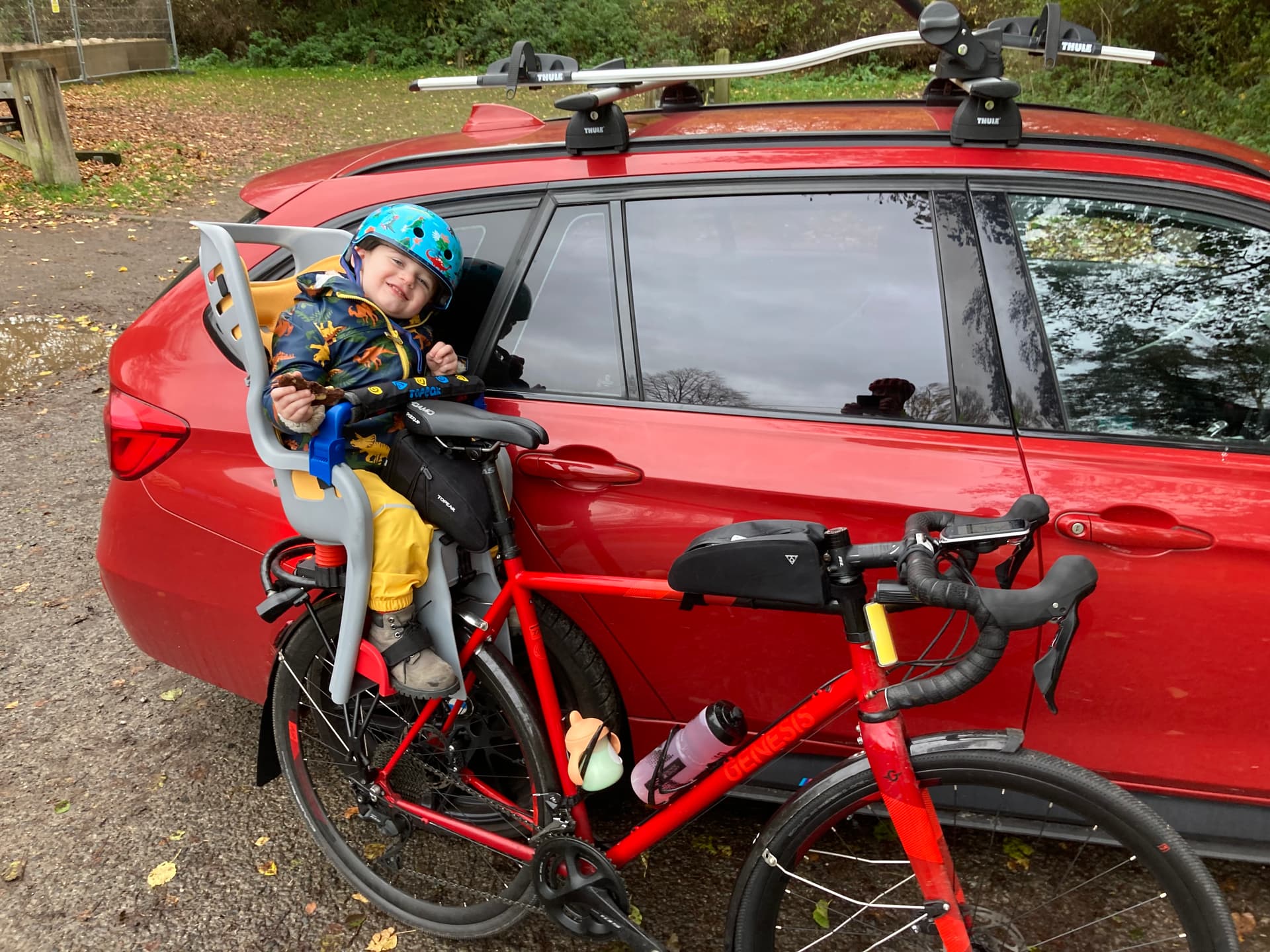 Today: Trail Bike with toddler in child seat: 28.43km, 588m elev. 2hrs, 14.2km/h. Av HR 121, Max 159. Av 154W, NP 222W. TSS 97. Bit of a struggle to begin with, 150m elev gain in the first mile, then 2km later another 75m in 600m. Running 34/34 as lowest gear, but not able to get out of saddle doesn’t help. He slept most of the way round, after getting travel sick on the way there in the car.