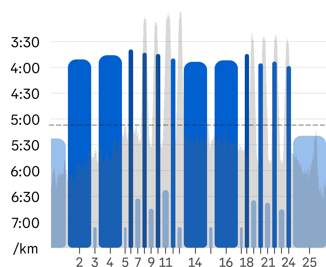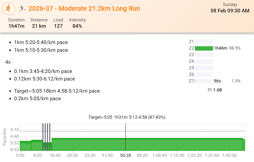 Moderate 18km (~75-80% of estimated 5km, 84% of Threshold) but with the warm-up and some strides a Half Marathon training run.