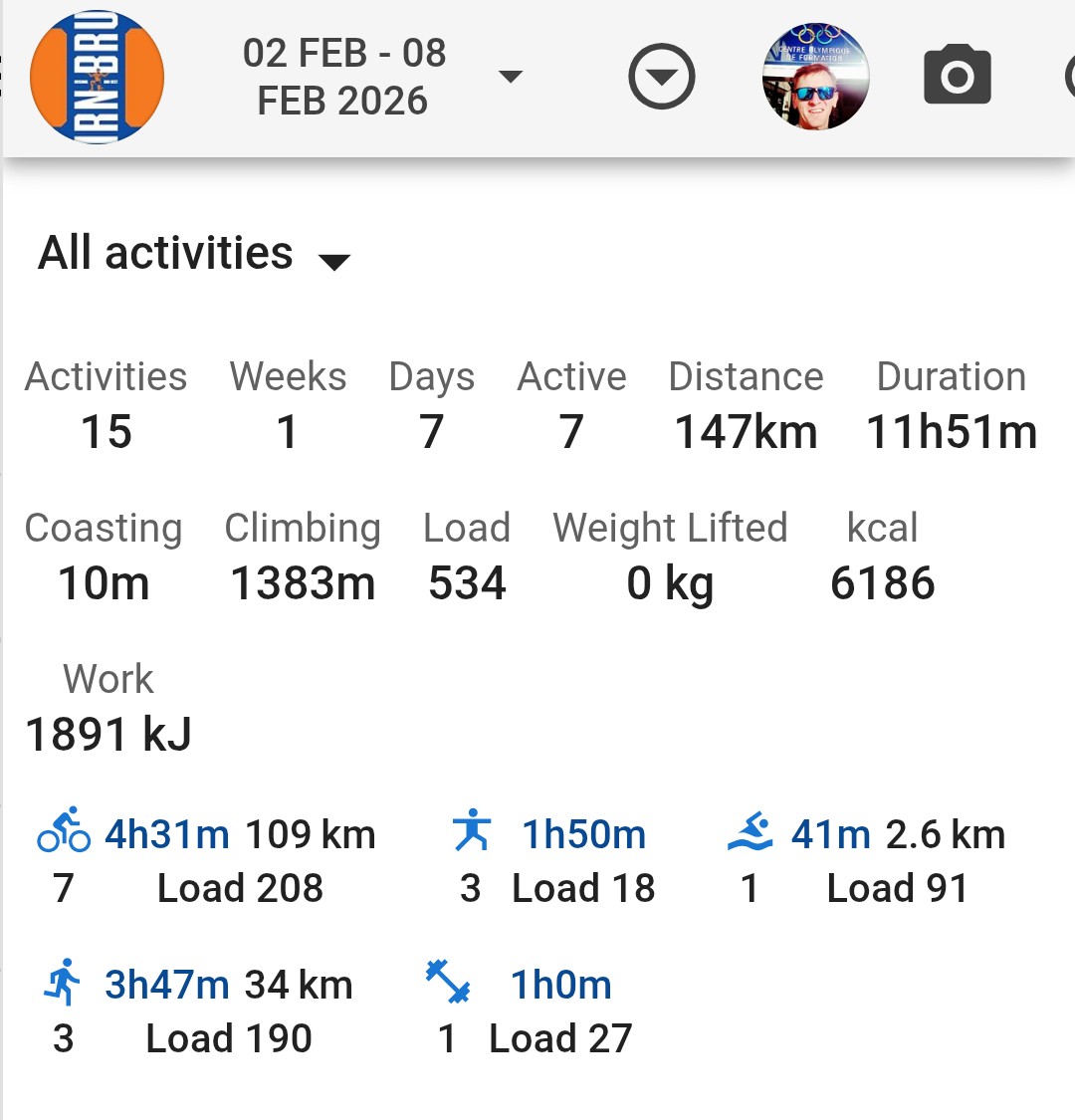 The week wasn’t helped by being away then not knowing whether I was coming down with something, and only running 6K. Including the power hike on Monday I managed about 7.5 hours, that excludes a couple of gym sessions though.