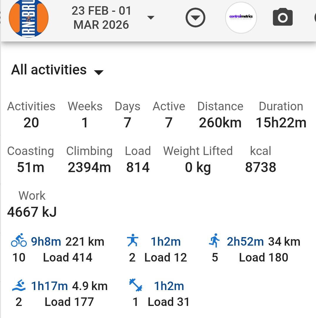Strava says 8 hours exactly for me this week, pretty much 6 on the bike after a windy slog for a couple of hours this morning. Don’t think I’ll be doing anything else today as I’m going out soon for my sisters 50th birthday meal.