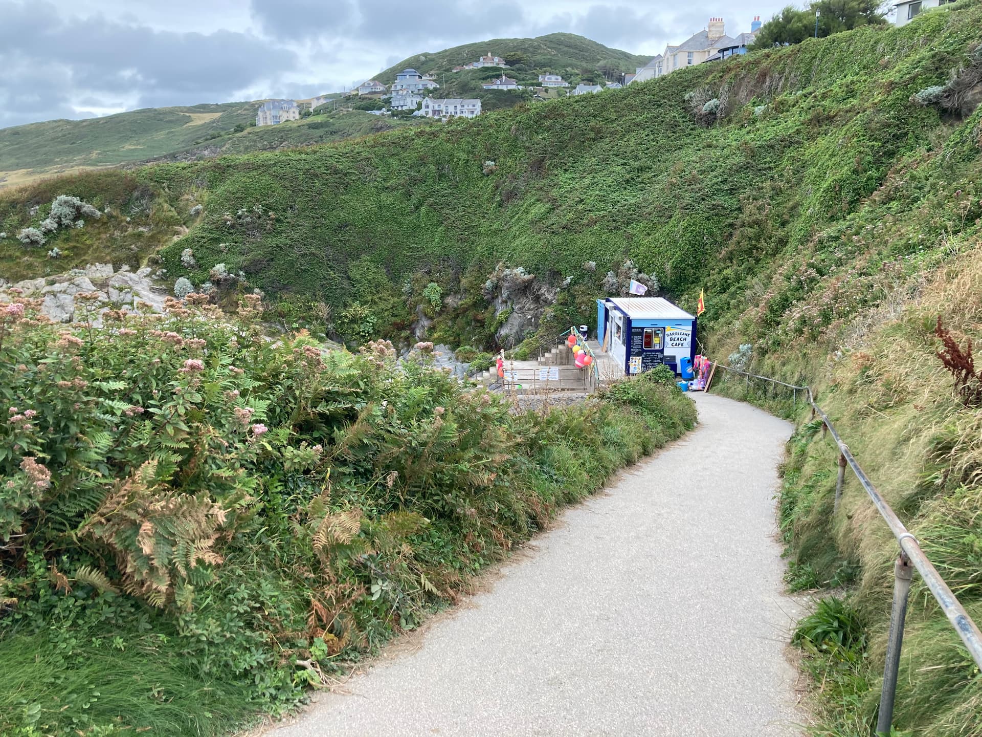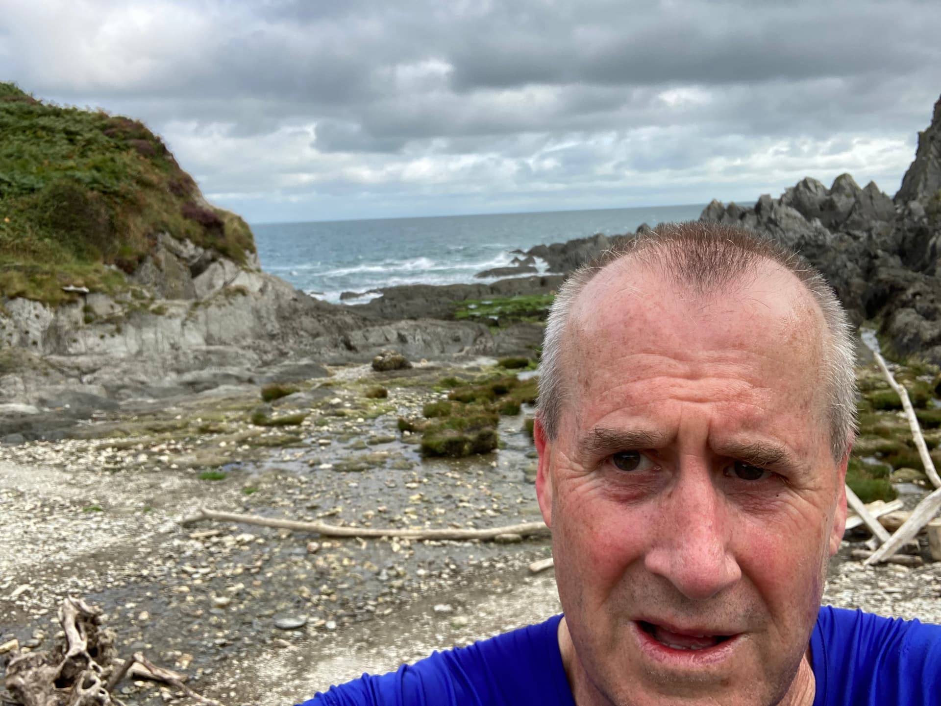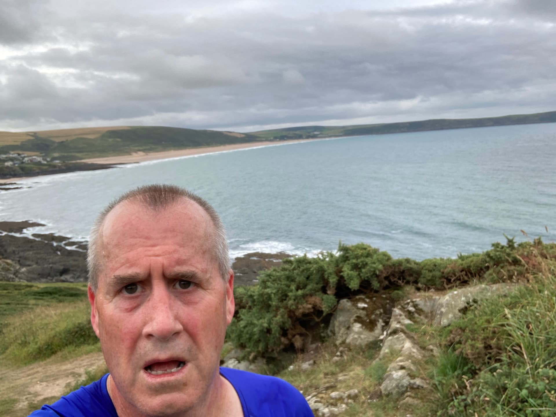 Got to Watersmeet and the bloody van wasn’t there. I trotted on and caught the walking guy. We chatted, walked into Woolly where I inhaled a Coke, sausage roll and more water. Then I just walked back with my new mate across the beach.