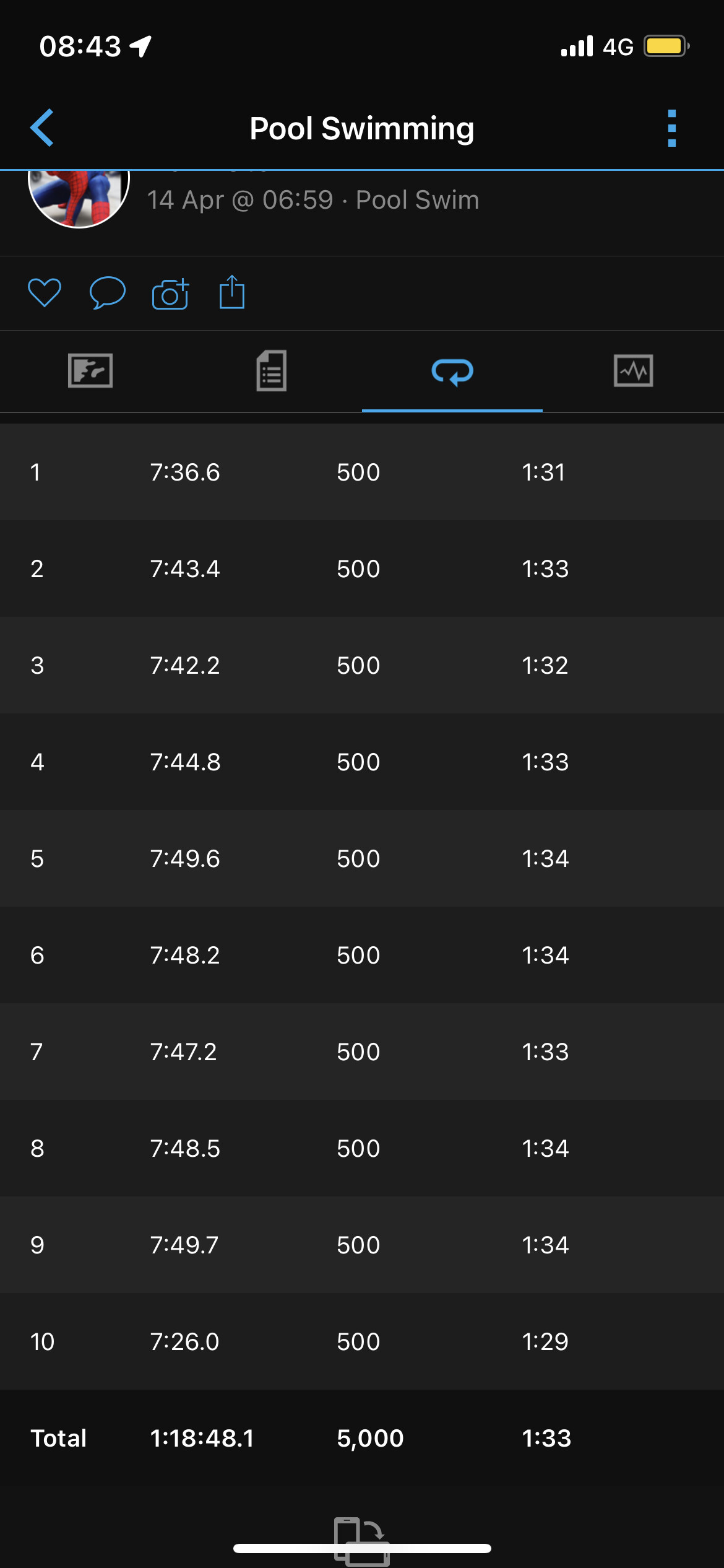Only been back in the pool once a week for last 8 weeks. Trying to just get back into it. Tried a longer set today; no breaks - just lapped the watch to see some splits. RPE felt the same throughout. Oh my ![]()