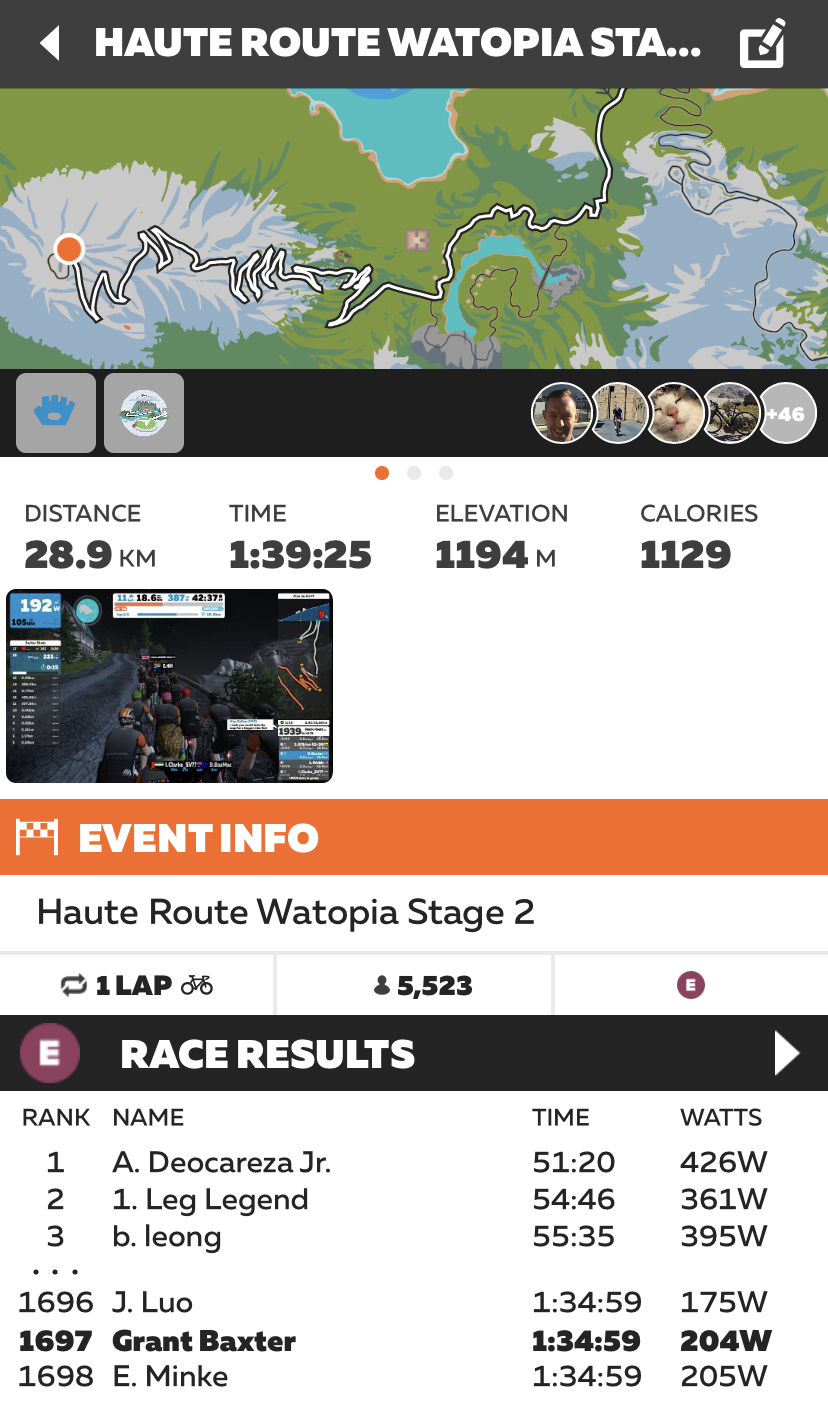 I missed stage 1 yesterday (did a crit race instead), but enjoyed stage 2 today. I held AP 203w and NP 206w, for 69kg so almost 3 wkg for 1h35m (Zwift says 1h39). When I say I enjoyed it, let’s be honest: it was horrific and brutal and my butt cheeks hurt. I was not sure where I finished (As in I stumbled off the trainer into a pool of sweat and couldn’t move for a little while), but the companion app says 1697