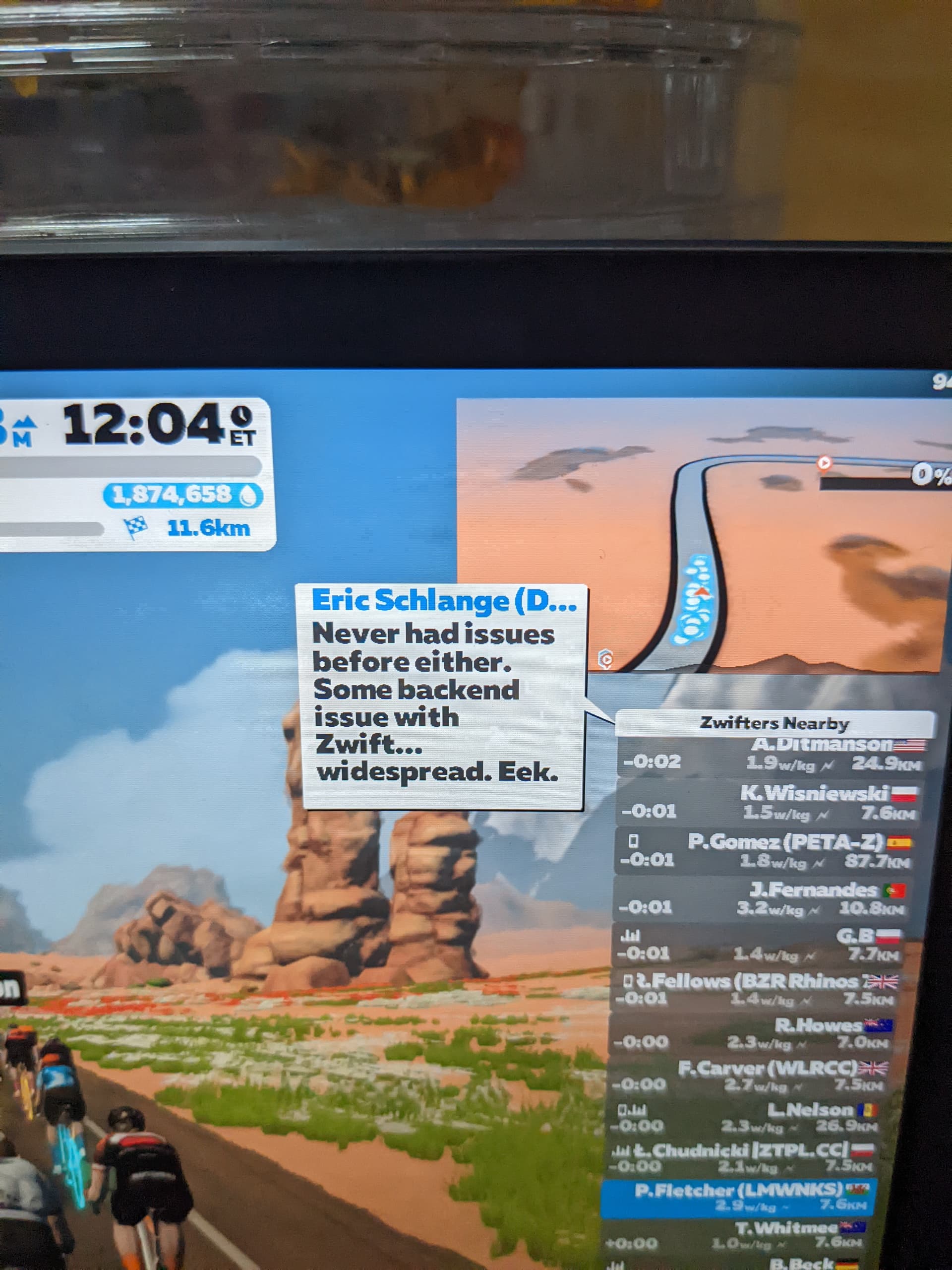 Massive zwift fuck up. Nobody can get in to wtrl. I’m riding ‘with’ Eric Schlange and he’s getting well stressed.